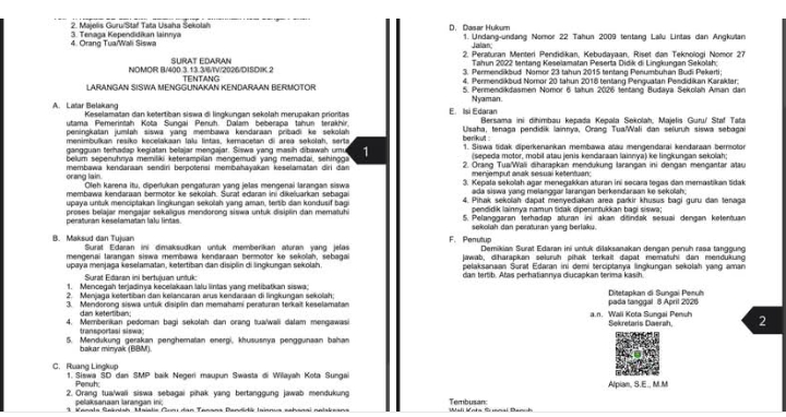 Jambireview.com, Sungaipenuh – Pemerintah Kota Sungai Penuh melarang siswa SD dan SMP membawa sepeda motor ke sekolah melalui surat edaran resmi.